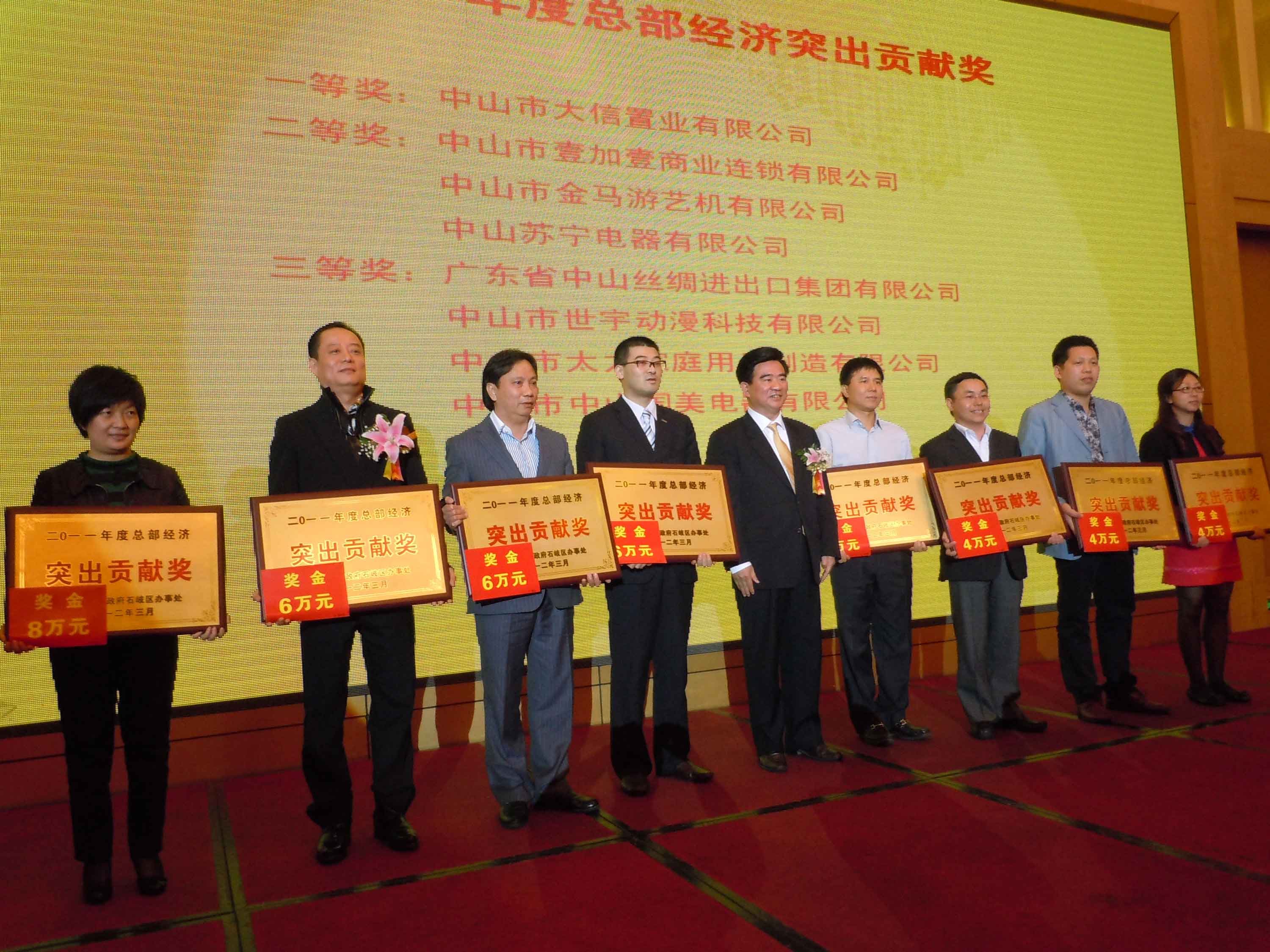 晚會(huì)上,石岐區(qū)辦事處為全區(qū)經(jīng)濟(jì)發(fā)展作出突出貢獻(xiàn)的42家企業(yè)及協(xié)會(huì)共計(jì)54個(gè)項(xiàng)目進(jìn)行了通報(bào)表彰。在過去一年里,我司著力推進(jìn)產(chǎn)業(yè)轉(zhuǎn)型升級(jí),向高科技4D動(dòng)漫影視娛樂項(xiàng)目延伸,以科技創(chuàng)新帶動(dòng)發(fā)展,為區(qū)內(nèi)經(jīng)濟(jì)騰飛作出了突出貢獻(xiàn),受到了區(qū)辦事處的肯定與嘉許,榮獲“二〇一一年度總部經(jīng)濟(jì)突出貢獻(xiàn)獎(jiǎng)”、“二〇一一年度企業(yè)自主創(chuàng)新及科學(xué)技術(shù)獎(jiǎng)”、“二〇一一年度企業(yè)黨建促發(fā)展先進(jìn)獎(jiǎng)”等三大獎(jiǎng)項(xiàng),共獲得了石岐區(qū)10萬元的獎(jiǎng)金獎(jiǎng)勵(lì)。鄧志毅董事長(zhǎng)、曾慶遠(yuǎn)副總經(jīng)理及楊焯彬書記分別代表公司上臺(tái)領(lǐng)獎(jiǎng)。