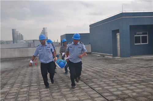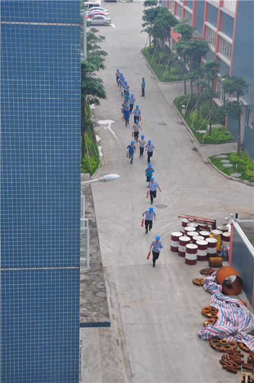 本次演練以消防重點(diǎn)車(chē)間的頂層出現(xiàn)火災(zāi)警情為模擬場(chǎng)景,于計(jì)劃當(dāng)日下午15:45進(jìn)行。在正式開(kāi)始前,金馬義務(wù)消防隊(duì)在公司大門(mén)集結(jié),配備相關(guān)設(shè)備整齊列隊(duì),等待總指揮下達(dá)啟動(dòng)命令。時(shí)間一到,由生產(chǎn)中心高總、人力資源中心容部長(zhǎng)示意行動(dòng)開(kāi)始,保安隊(duì)長(zhǎng)接受命令,并向待命的消防隊(duì)傳達(dá)立即到處滅火的指示。接到消息,金馬義務(wù)保安隊(duì)火速奔赴火警現(xiàn)場(chǎng)——距離出發(fā)點(diǎn)300多米的車(chē)間4樓頂層。僅用時(shí)2:37,撲火組已到達(dá)現(xiàn)場(chǎng),根據(jù)燃燒物特性,用滅火器迅速進(jìn)行第一輪滅火。待火勢(shì)稍減,他們快速移開(kāi)燃燒物,阻擾火勢(shì)蔓延,并打開(kāi)消防喉進(jìn)行撲救。與此同時(shí),救護(hù)組也已到達(dá)現(xiàn)場(chǎng),展開(kāi)擔(dān)架轉(zhuǎn)移傷員,到達(dá)安全場(chǎng)所進(jìn)行搶進(jìn)。不久,火勢(shì)撲滅,在各消防小組的密切配合下,本次消防演練勝利結(jié)束。