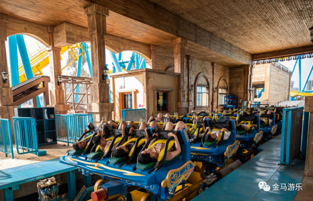 與其他飛行過山車不同,金馬飛行過山車在站臺區(qū)車體位于軌道上方,配合水平面上下客平臺,改善了乘客臥姿上下的不適與不便,有效提升舒適度與運營效率,理論客流量達1440PPH。