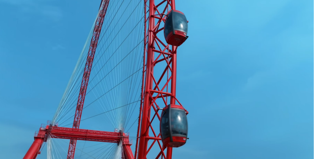 值得關(guān)注的是,金馬游樂在該項目上應(yīng)用了兩項創(chuàng)新技術(shù)方案,確保摩天輪的舒適及安全。吊廂伺服調(diào)平技術(shù),令每個吊廂在運行中始終處于水平狀態(tài),大幅提升吊掛式轎廂受到風(fēng)載荷時的平穩(wěn)性;雙驅(qū)動系統(tǒng)獨立運作方案,增強安全冗余,緊急狀況下無高空救援風(fēng)險。