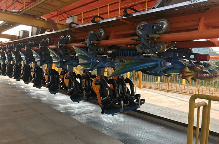 懸掛過山車的列車座椅懸掛于軌道下方,乘客懸空而坐,增加體驗(yàn)刺激度。列車經(jīng)由動力提升到軌道最高端后,轉(zhuǎn)為沿軌道自由高速滑行,乘客坐于座椅上時盡情地享受失重、倒轉(zhuǎn)和離心的強(qiáng)烈感覺。列車外觀可根據(jù)樂園特色定制,幫助樂園打造專屬特色。