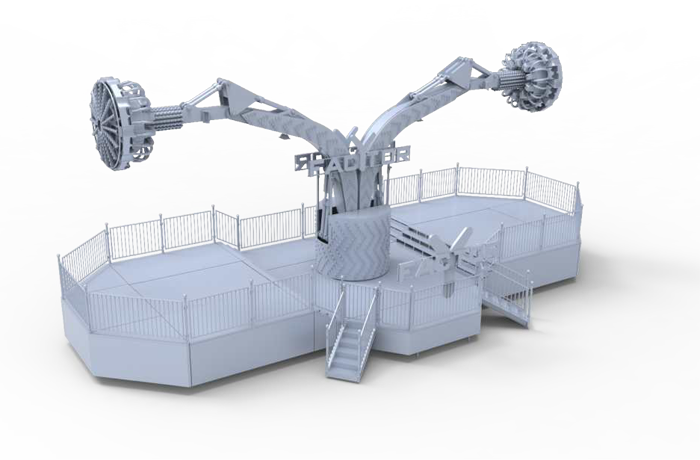 繞垂直軸旋轉、座艙繞支臂軸旋轉的陀螺類游樂設施;大臂向上拉升,到達上限位置后,座艙旋轉;傾斜運行、俯瞰大地,體驗翻倍;