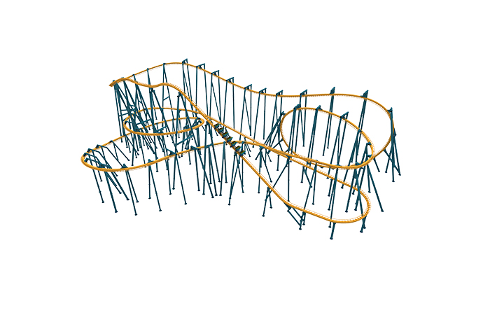 飛行姿態(tài)乘坐式過山車。軌道元素含括急速俯沖飛行、大俯沖飛行、卷餅形倒栽環(huán)、水平環(huán)等,滑行中乘客在軌面仰姿和軌下俯姿兩種姿態(tài)間連續(xù)切換,領(lǐng)略高空翱翔的刺激。與以往的飛行過山車不同,此款飛行過山車車體位于軌道上方,配合水平面上下客平臺(tái),改善了乘客臥姿上下的不適與不便,有效提升舒適度與運(yùn)營效率。