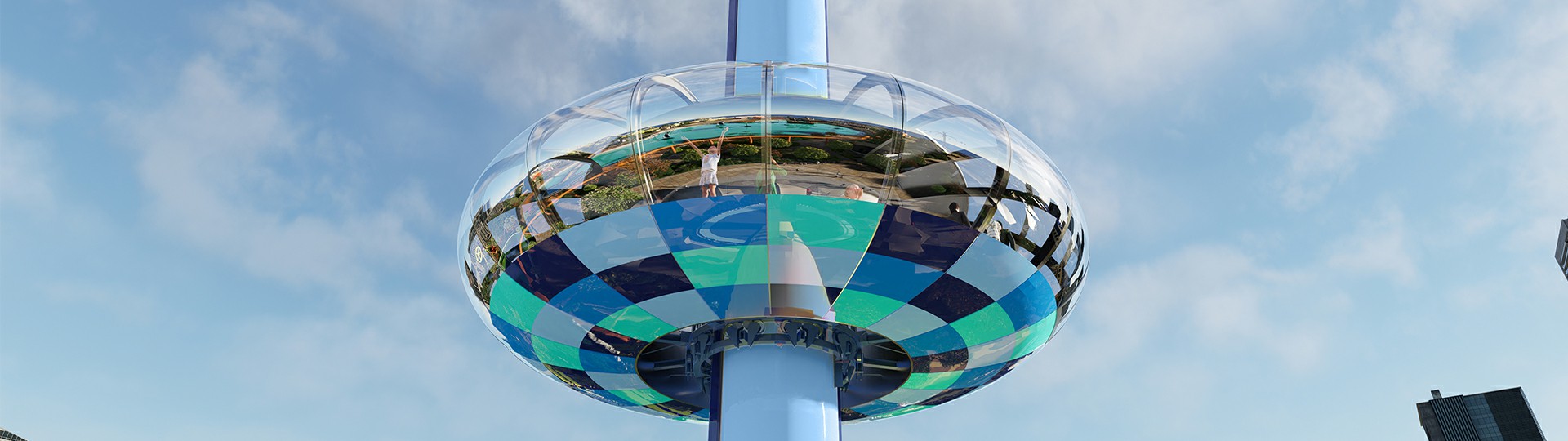 觀景塔擁有可容納100人的“甜甜圈”旋轉艙體,載客能力強。雙自動門進出口的設計便于快速上下客,運營高效。乘客在旋轉艙中360°環(huán)繞式縱情飽覽四周美景,還可通過艙內影音系統(tǒng)感受多元視覺盛宴。夜幕降臨燈光閃耀,璀璨奪目輕易打造夜場焦點,成為聚客地標。