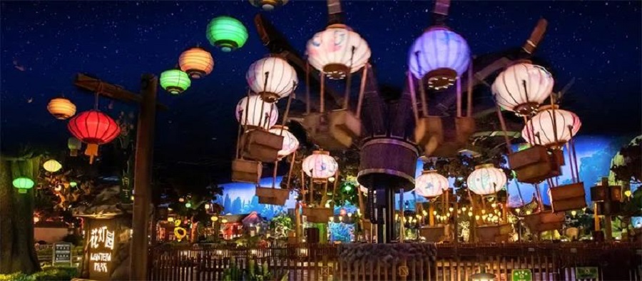 功夫熊貓蓋世之地屬于北京環(huán)球影城獨(dú)有,燈影傳奇也是國內(nèi)首創(chuàng)的設(shè)備。這一設(shè)備最大的特點(diǎn)是中國傳統(tǒng)文化跟現(xiàn)代游樂的相互融合,設(shè)備既有傳統(tǒng)建筑的元素,也有傳統(tǒng)燈籠的造型,燈籠上還有經(jīng)典的皮影戲元素;通過這些,把傳統(tǒng)文化以一種動(dòng)態(tài)的體驗(yàn)呈現(xiàn)給游客。為了還原中國復(fù)古燈籠的造型和效果,我們從燈籠骨架的設(shè)計(jì)、布料的選型、圖案的印刷工藝、縫制工藝到燈光的變色控制等,都經(jīng)過了反復(fù)的測(cè)試和改良,其中燈籠布料的選材既要求布料潤澤有質(zhì)感,又要經(jīng)久耐用能承受長期的張力,還要彈性軟硬適中不能起一絲皺褶,為此我們經(jīng)歷了6輪試制與測(cè)試,反復(fù)改良工藝,力求每個(gè)細(xì)節(jié)都能完美展現(xiàn)中國傳統(tǒng)燈籠的效果。